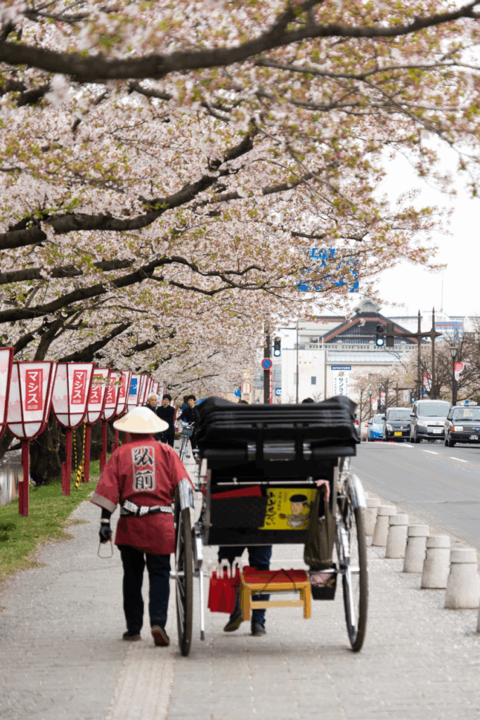 มีรถลากแบบโบราณ บริการลากชมซากุระอยู่ด้วย
