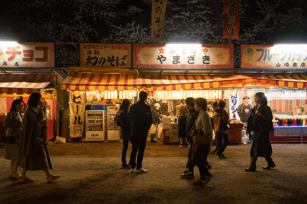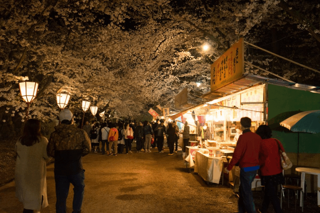 ตอนกลางคืนก็ยังไม่เลิกชมซากุระกัน ยิ่งดึกคนยิ่งเยอะ ยิ่งกินหนักขึ้น