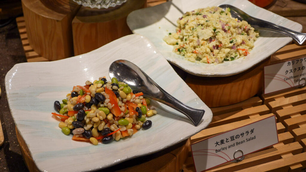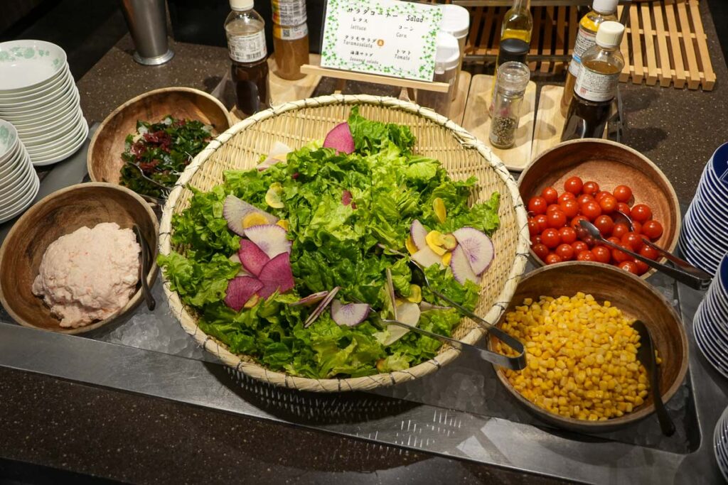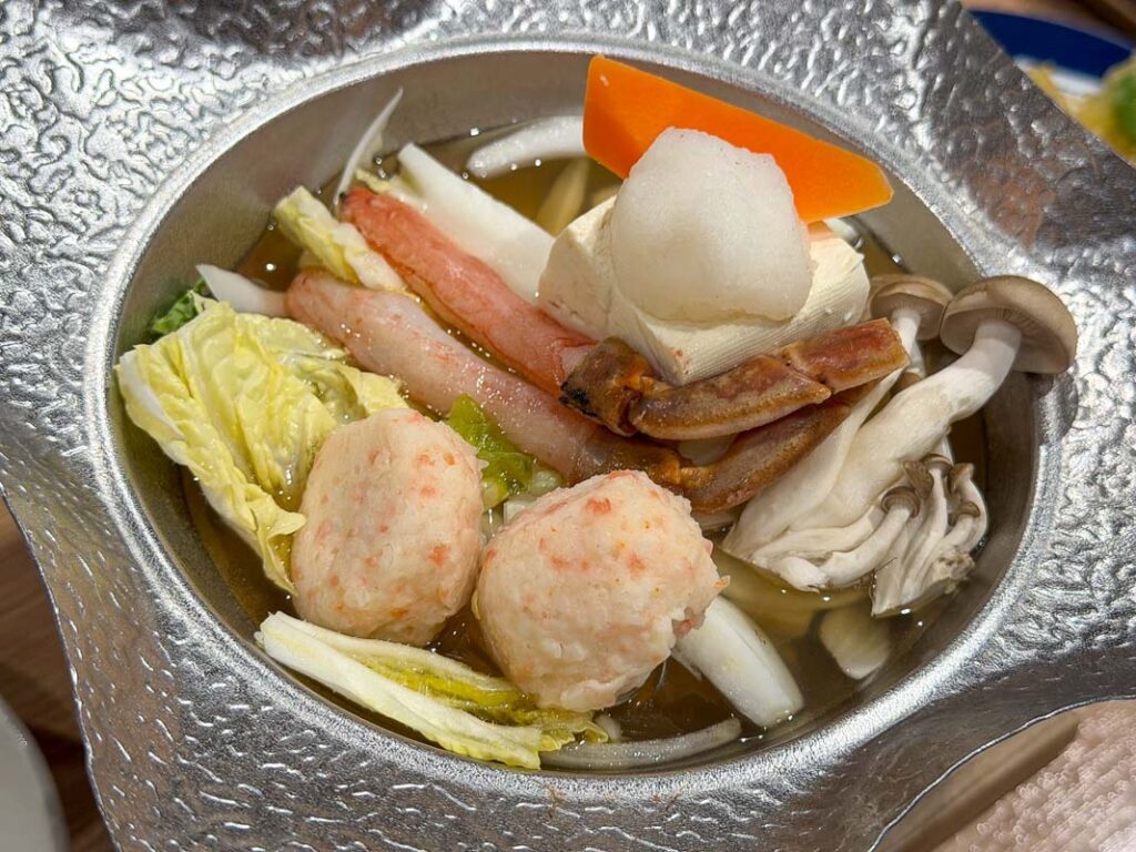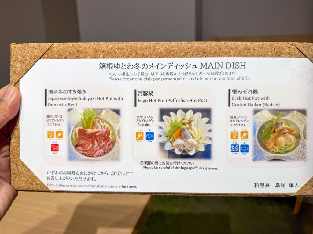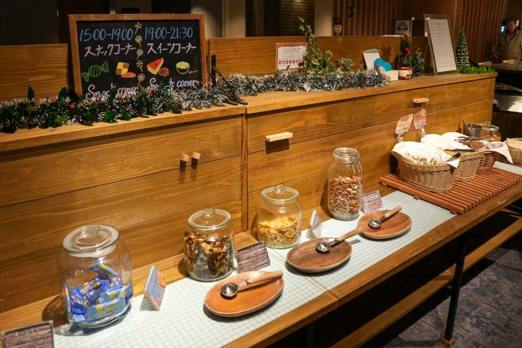 ห้องอาหารมื้อเย็นของโรงแรมจะเป็นแบบ Half Buffet คือสั่งจานหลักก่อนซึ่งจานหลักของฤดูกาลนี้คือ อาหารประเภทหม้อไฟ (นาเบะ) โดยสามารถเลือกเมนูที่ชอบได้ จะมีปู, ปลาปักเป้า หรือ สุกี้ยากี้ แล้วเราก็ไปเลือกตักบุฟเฟ่ต์ได้เลย ที่นี้จะเป็นแนวนานาชาติ มีอาหารหลากหลายและคุณภาพดีมาก