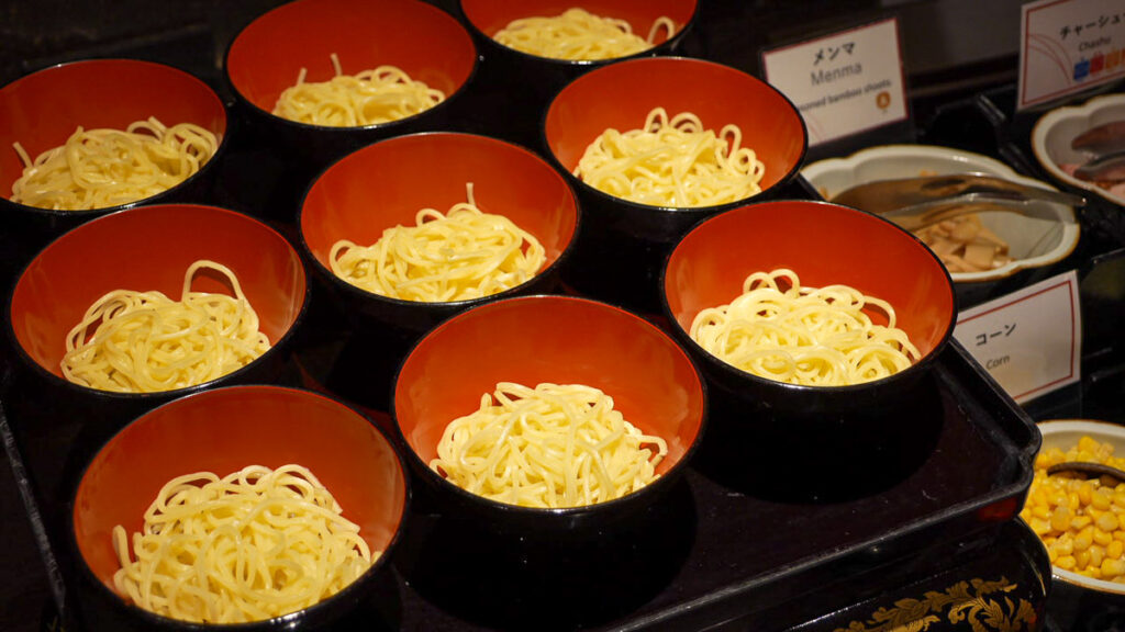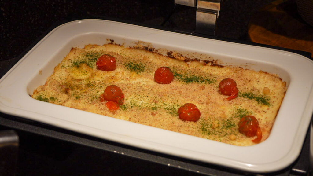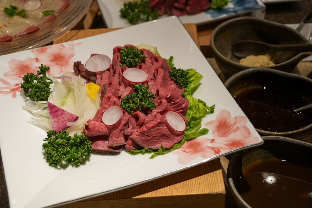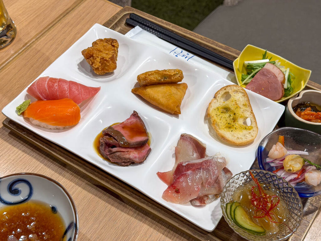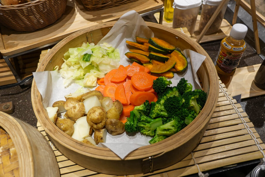 ห้องอาหารมื้อเย็นของโรงแรมจะเป็นแบบ Half Buffet คือสั่งจานหลักก่อนซึ่งจานหลักของฤดูกาลนี้คือ อาหารประเภทหม้อไฟ (นาเบะ) โดยสามารถเลือกเมนูที่ชอบได้ จะมีปู, ปลาปักเป้า หรือ สุกี้ยากี้ แล้วเราก็ไปเลือกตักบุฟเฟ่ต์ได้เลย ที่นี้จะเป็นแนวนานาชาติ มีอาหารหลากหลายและคุณภาพดีมาก
