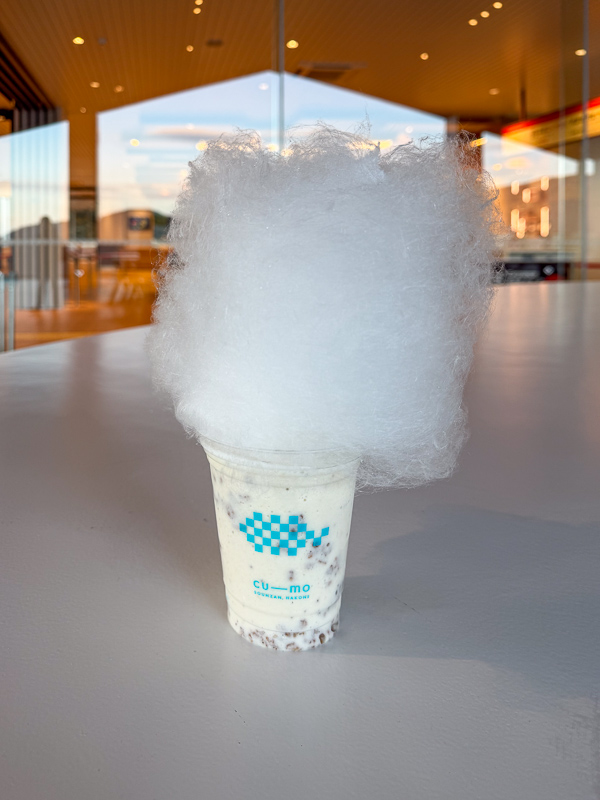 ต่อไปเราก็นั่งกระเช้าลงมาที่สถานี Sounzan เพื่อมา cu―mo ซึ่งตั้งอยู่บนชั้น 2 ของสถานี Sounzan สถานีจุดเปลี่ยนจากกระเช้าลอยฟ้าเป็นเคเบิ้ลคาร์ ที่นี่มีจุดพักผ่อนทั้งคาเฟ่และออนเซ็นเท้าที่มีระเบียงหันหน้าออกไปชมวิว จึงสามารถเพลินเพลินกับวิวทิวทัศน์ภูเขาของเมือง Gora ของฮาโกเน่ได้ ขณะแช่เท้าแนะนำให้ซื้อเครื่องดื่มสมู้ทตี้ที่มีสายไหมทรงก้อนเมฆจากคาเฟ่มาดื่มด้วย