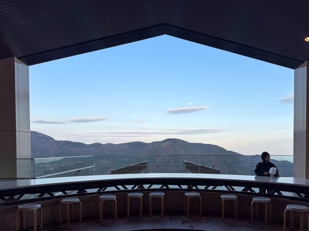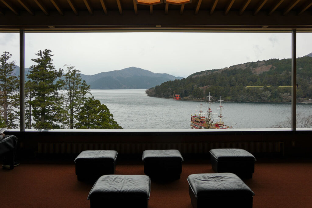 จุดที่ทำให้พิพิธภัณฑ์นี้โด่งดังที่สุดคือ เลานจ์ชมวิว (Panorama Lounge) ที่มีหน้าต่างกระจกบานใหญ่ยาวกว่า 50 เมตร จะมองเห็นทั้งทะเลสาบอาชิ เสาโทริอิ และภูเขาไฟฟูจิ (ถ้าฟ้าเปิด ช่วงเราไปหมอกยังลงอยู่)
