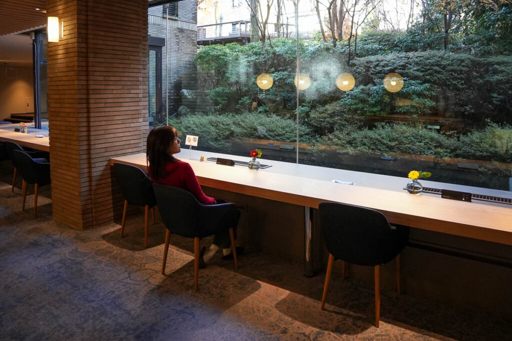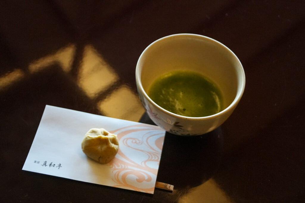 ร้านน้ำชา Shinwa-tei หลังเดินชมสวน สามารถแวะจิบ ชาเขียวมัทฉะ พร้อมทานขนมหวานญี่ปุ่นแบบดั้งเดิมที่ร้านน้ำชาภายในสวนได้ ความพิเศษคือคุณจะได้นั่งจิบชาพร้อมกับมองวิวสวนมอสผ่านหน้าต่างบานใหญ่ ให้ความรู้สึกเหมือนกำลังมองภาพวาดที่มีชีวิต