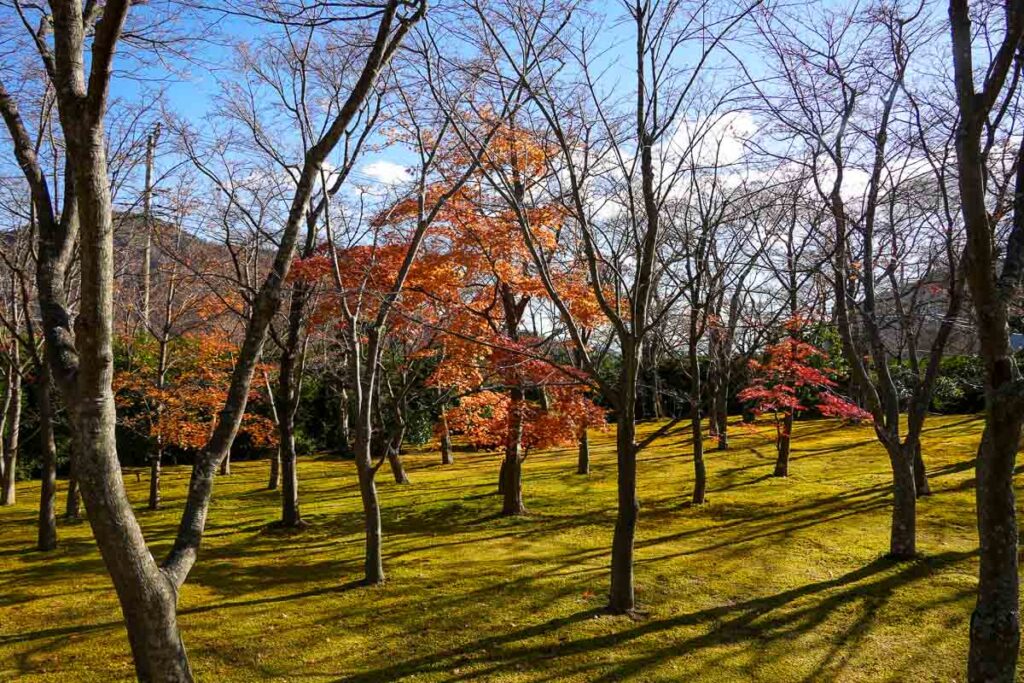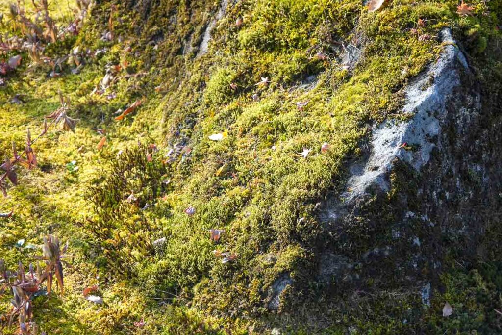 มีมอสมากกว่า 130 สายพันธุ์ปกคลุมพื้นดินราวกับพรมสีเขียวตัดกับต้นเมเปิ้ล กว่า 200 ต้น ถ้าสังเกตดีๆ จะเห็นว่าต้นเมเปิ้ลที่นี้ต้นเล็ก ทั้งๆที่สวนแห่งนี้เปิดมา 50 กว่าปีแล้ว เพราะทางสวนตั้งใจให้ต้นไม้ยังเล็ก คือถ้าต้นไหนใหญ่เกินไปเขาจะขุดออกและนำต้นใหม่ที่สูงใกล้เคียงกันมาแทน ทำให้สวนแห่งนี้มีต้นเมเปิ้ลที่มีความสูงไล่ระดับเท่ากันนั่นเอง การดูแลสวนไม่ธรรมดาจริงๆ
