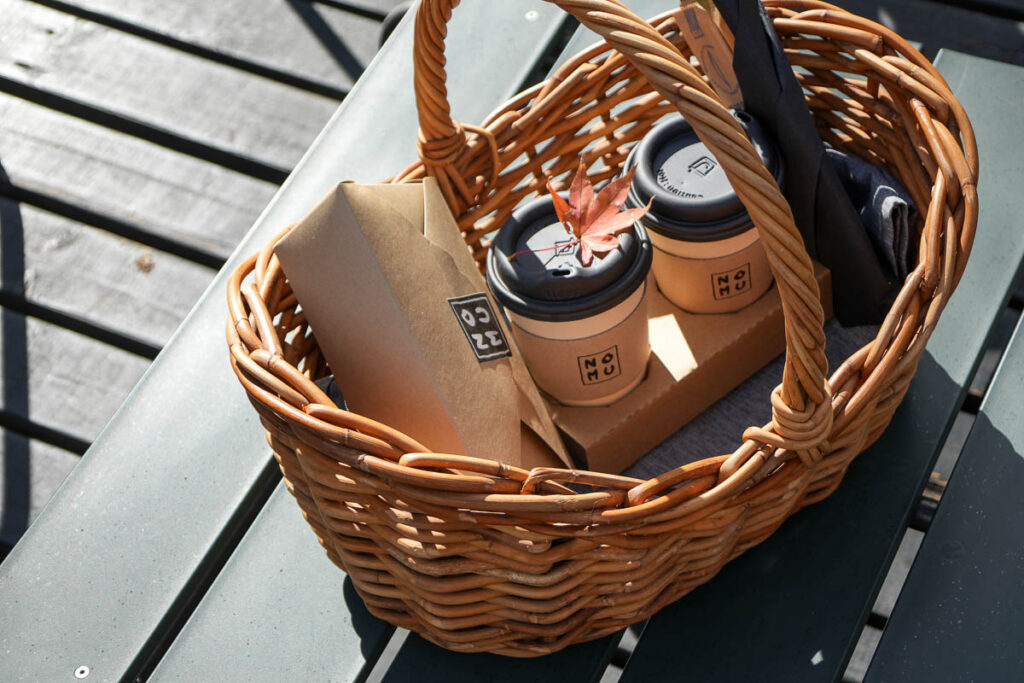 สามารถซื้อของกินที่คาเฟ่ แล้วทางร้านก็ใส่ตระกร้าปิคนิคให้เราไปทานตามจุดต่างๆของสวนได้