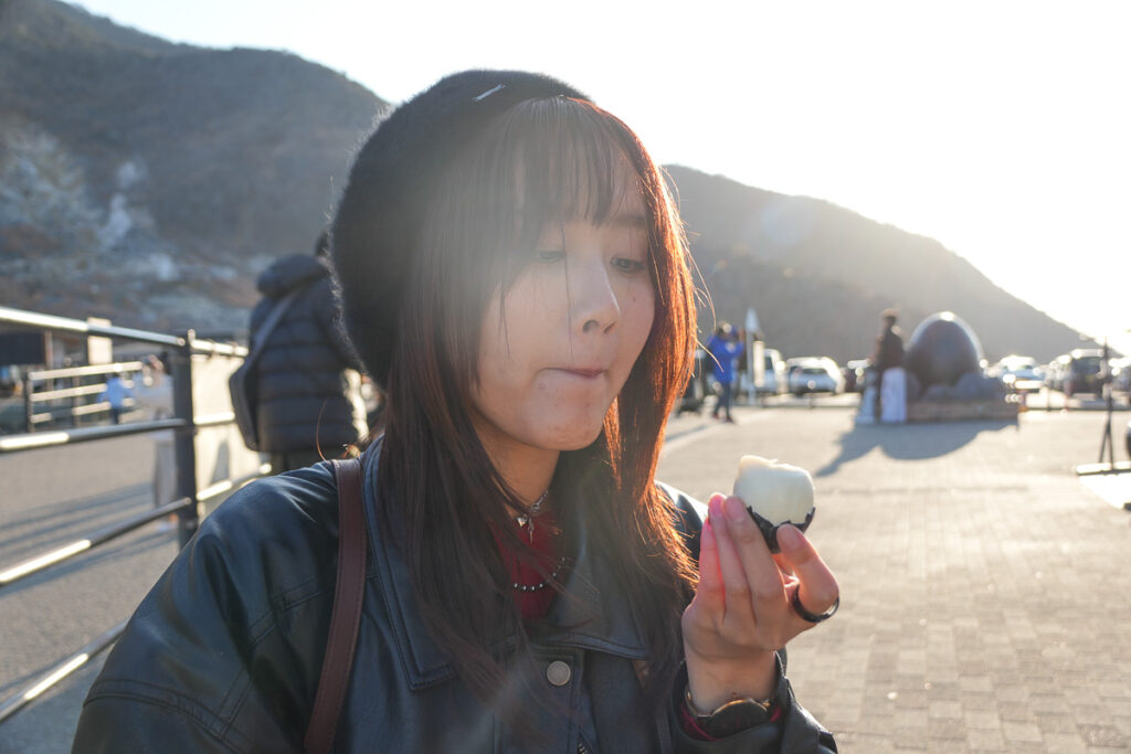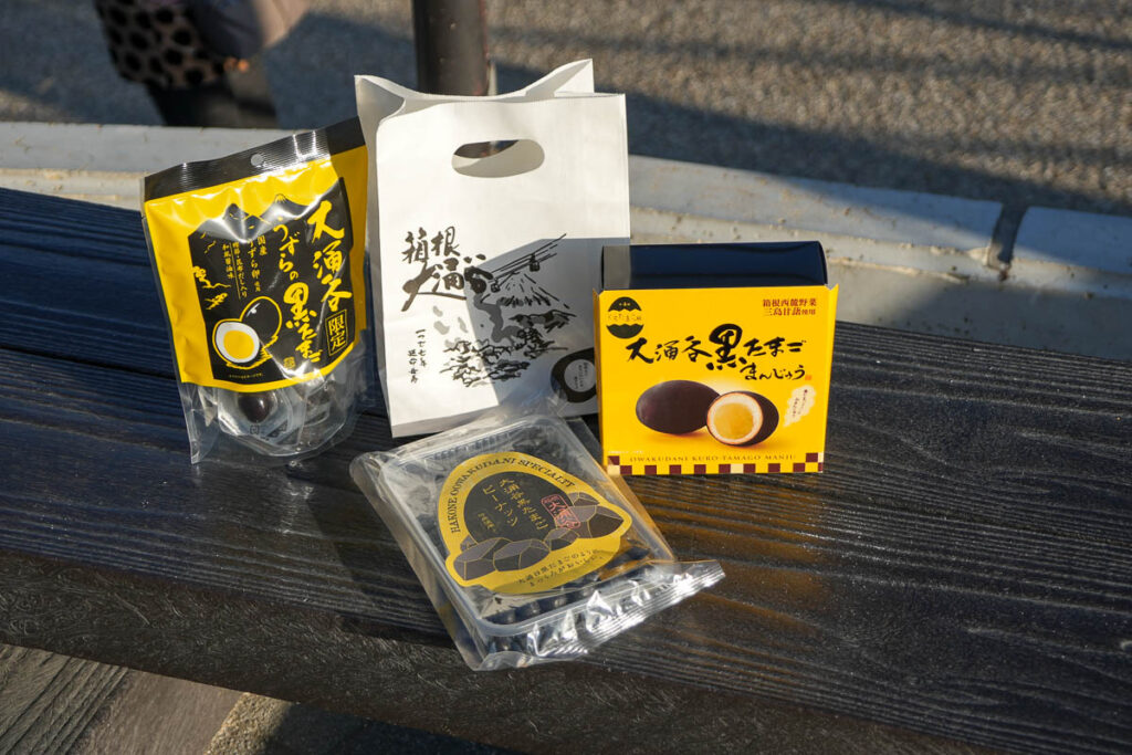 คือไข่ไก่ที่นำไปต้มในบ่อน้ำพุร้อนที่มีแร่ธาตุกำมะถันและเหล็กสูง ปฏิกิริยาทางเคมีทำให้เปลือกไข่กลายเป็น สีดำสนิท แต่ข้างในยังเป็นไข่ต้มสีขาวรสชาติปกติ จะมีเกลือมาให้กินคู่กัน มีตำนานเล่าว่า กินไข่ดำ 1 ฟอง จะทำให้อายุยืนขึ้นอีก 7 ปี สามารถซื้อได้จากร้านขายของฝากด้านใน