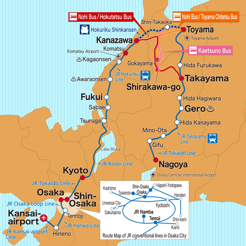 - รถบัส Nohi : รถบัส Hokutetsu / รถบัส Toyama Chitetsu / รถบัส Toyama Chitetsu / รถบัส Hokutetsu (เส้น Takayama – Shirakawa-go – Kanazawa) / สาย Toyama (เส้น Takayama Nohi Bus Center – Shirakawa-go – Kanazawa/Toyama) *จำเป็นต้องจองล่วงหน้า ยกเว้นบางรอบ
