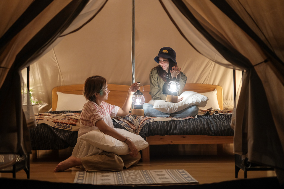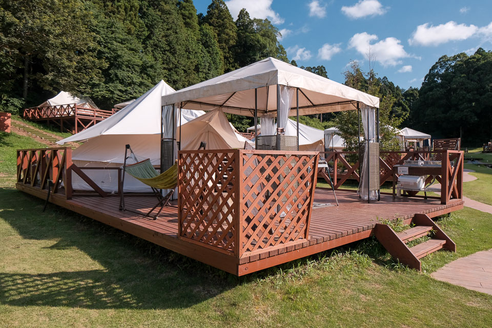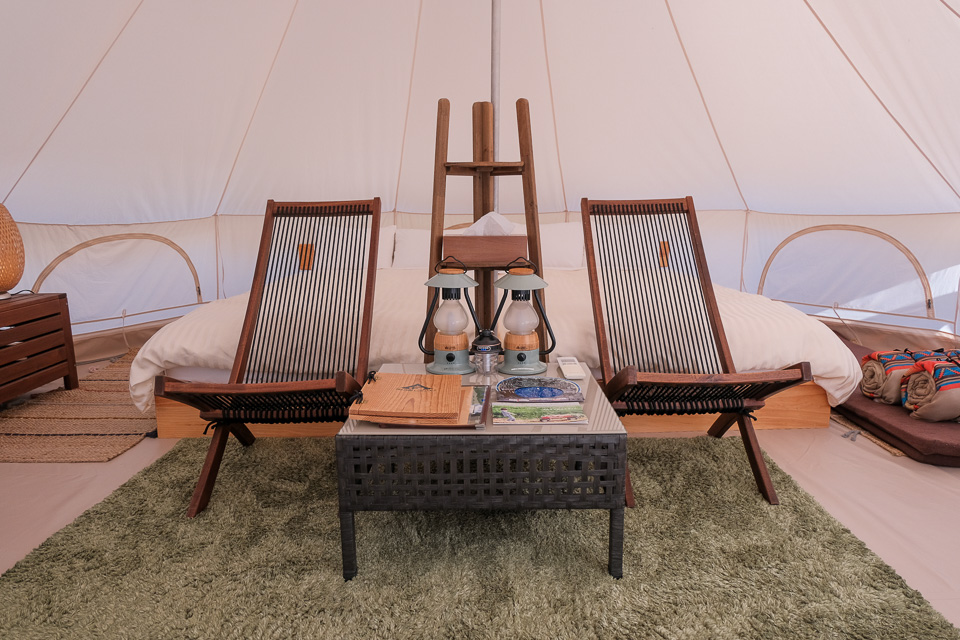 ใครที่เป็นสายแคมป์ล่ะก็ต้องชอบที่พักประเภทนี้ เพราะที่นี่มีโซนสำหรับกางเต็นท์เองด้วย แต่ไม่ต้องห่วงว่าจะต้องแบกเต็นท์มาให้หนัก เพราะที่นี่มีให้บริการเช่าเต็นท์และอุปกรณ์ทุกอย่าง จึงสามารถมาเที่ยวได้แบบตัวเปล่าเลย และอุปกรณ์ของที่นี่ใช้ของแบรนด์ดังอย่าง Snow Peak ด้วย ทำให้สามารถมั่นใจในคุณภาพได้อย่างไร้กังวล